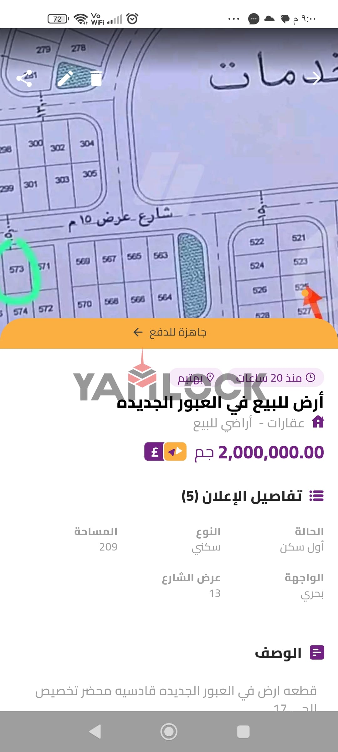 أرض209 م² للبيع فى العبور الجديده قادسيه محضر تخصيص الحى 17 بلوك 7 رقم القطعه 525