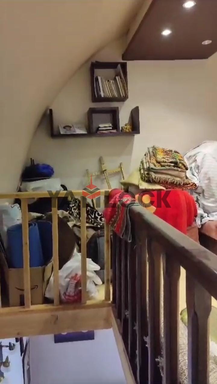 الدور الأول (علوي): غرفتين نوم + دريسنج روم خشب متقفل تقفيل محترم ومستقل + ريسيبشن + حمام + مطبخ صغير + روف متقفل بسلم خشب داخلي (يظهر بوضوح في الفيديوهات)، يصلح لغرفة نوم إضافية أو مكتب منزلي